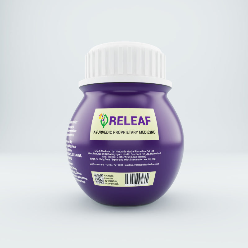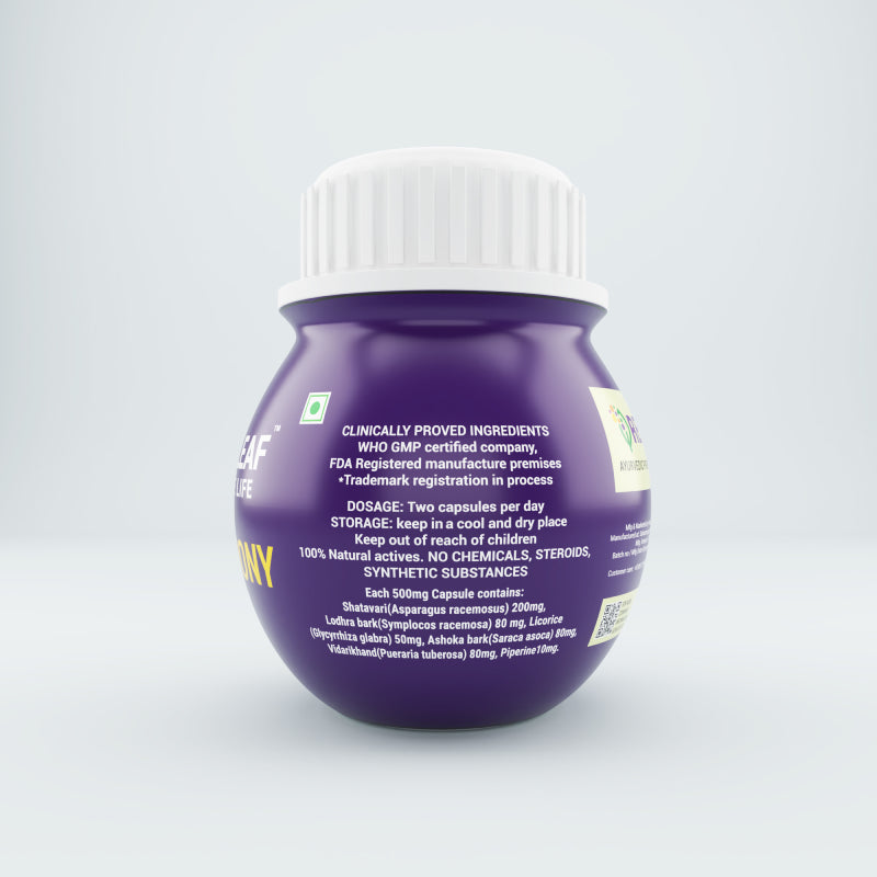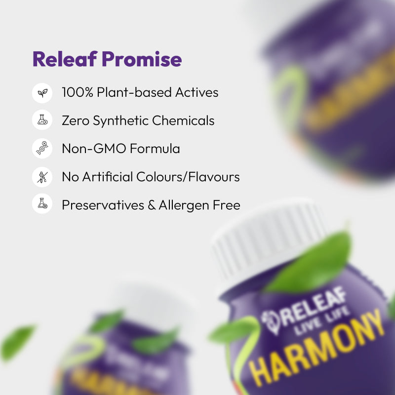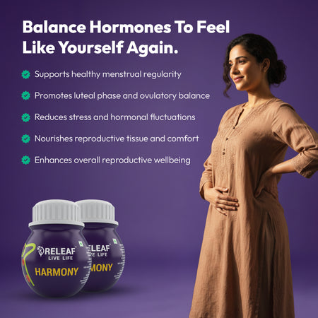 Releaf Harmony offers a gentle, natural path with scientifically crafted Ayurvedic hormone balance supplement designed to naturally restore balance. Powered with Shatavari, Lodhra bark, Licorice, Ashoka bark, Vidarikhand and Piperine it works in harmony to regulate cycles, support emotional balance, and promote overall endocrine wellness. It’s a vegan and GMP-certified herbal supplement for menstrual cycle regulation, free from artificial colors, common allergens, unnecessary fillers, and the harsh side effects of synthetic solutions, designed to nurture the body’s innate wisdom for sustained energy, calm, and vibrant wellbeing
