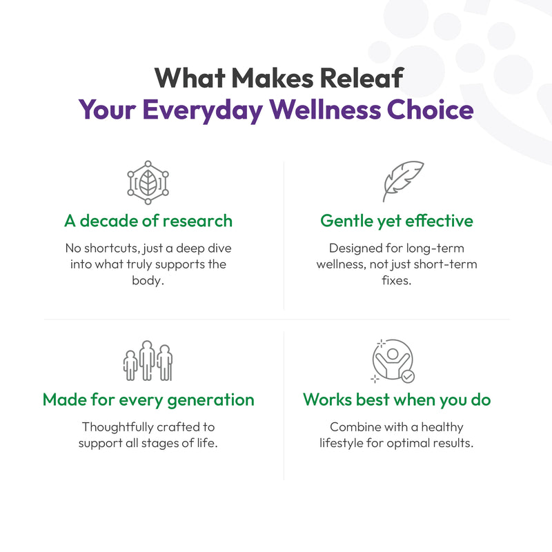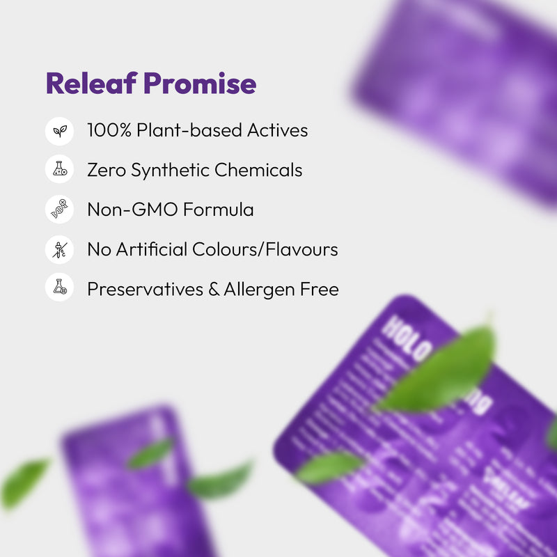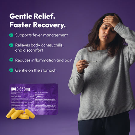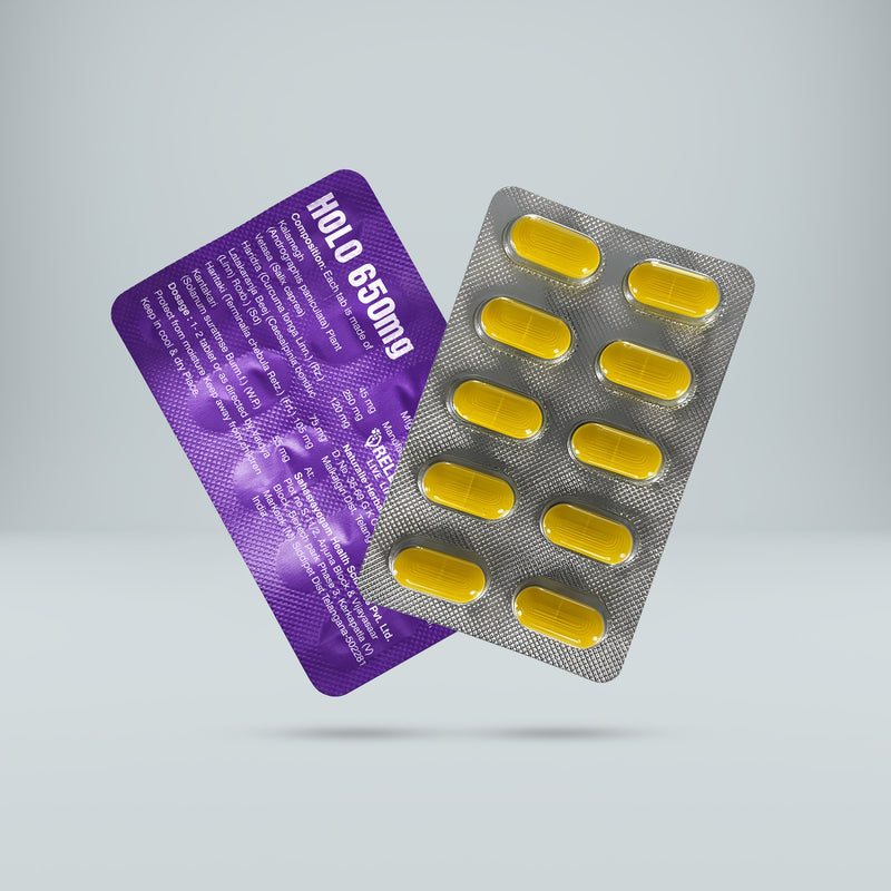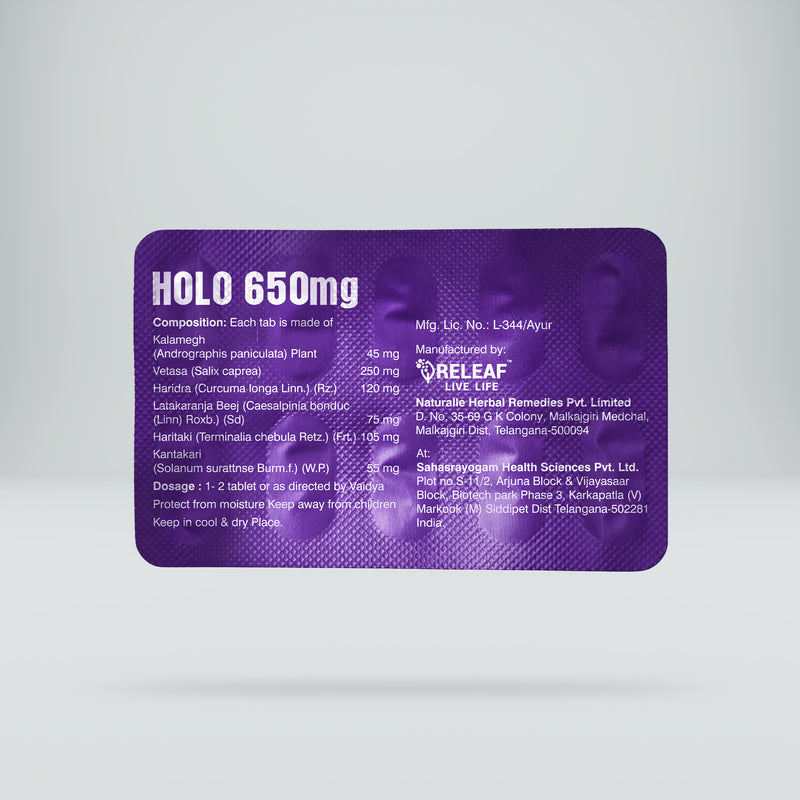 Releaf HOLO-650 is a scientifically formulated Ayurvedic supplement made with Kalamegh, Vetasa, Latakaranja Beej, Haritaki, and Kantakari to support the body’s natural response to fever, inflammation, and discomfort. Made with 100% plant-based herbal actives and enhanced with liposomal technology for better absorption, this ayurvedic anti-inflammatory medicine works deep to reduce inflammation, ease body aches, and support holistic recovery, without reliance on synthetic chemicals.