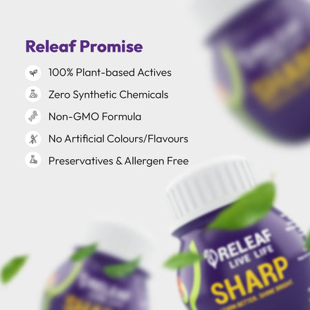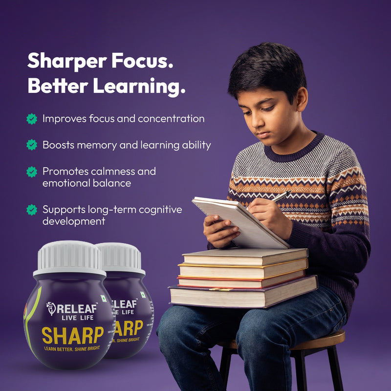 Releaf SHARP is a licensed Ayurvedic brain tonic specially formulated to support cognitive development in children and teenagers. Rooted in ancient Ayurvedic wisdom with classical herbs like Ashwagandha, Sarpagandha, Brahmi, and Kumkuma, this natural focus supplement for children is backed by modern research to help nourish the brain, improve cognitive performance, and promote calm, attentive thinking, supporting children in reaching their full potential.